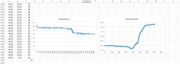 Como se puede ver en la imagen, la impedancia de la piel disminuye con el esfuerzo, el estrés o el pánico. También está aumentando la temperatura de la piel en esas condiciones.