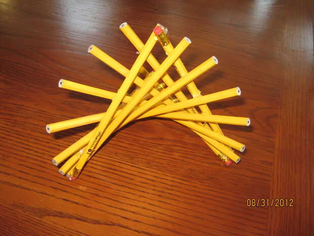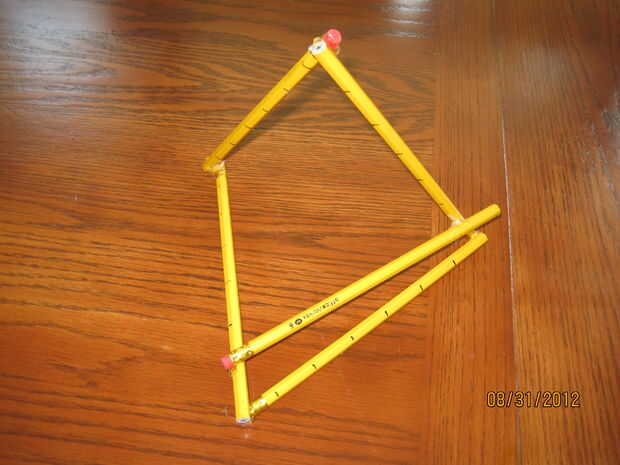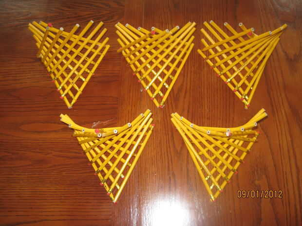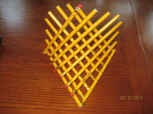 Línea de un borrador de lápiz en la parte exterior del marco en la marca más cercana al punto. Coloque el otro extremo del lápiz en la marca más cercana a la esquina opuesta. El lápiz sólo debe cuelgue un poco. Poner un punto de pegamento en cada punto donde los lápices toquen y mantenga el lápiz en su lugar hasta que se seque. Recomiendo pegar el borrador directamente a uno de los lápices para que no tenga que preocuparse por cortar a través del metal que sostiene el borrador más adelante (paso 5). Luego pasar a la segunda marca y repita. Una vez que han pegado todos los lápices en el exterior, voltee el marco y pegar en la dirección opuesta en el interior. Cuando los lápices se pegan en el, debe crear un efecto de la armadura de cesta. Repita con los otros 4 marcos y pasar el siguiente paso, recortar los lápices.