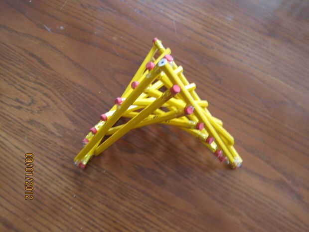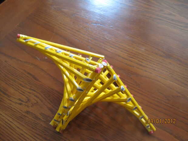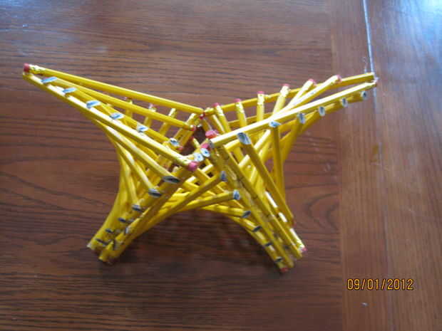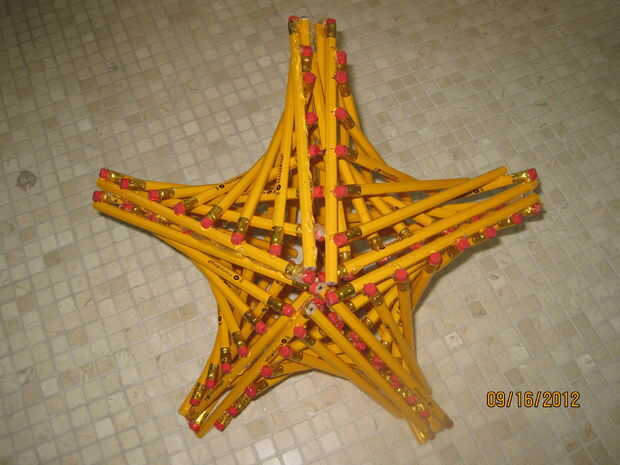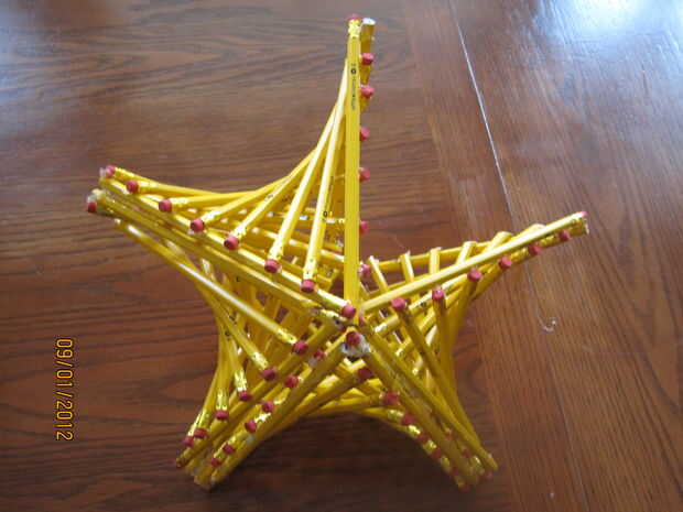 Ahora que se acaban todas las 5 piezas, simplemente pegarlos juntos!  Fila 2 de los triángulos grandes, pegamento de un lado y presionan juntos.  Continúe hasta que todas las 5 piezas son pegadas.  El pegamento caliente es flexible, por lo que si sus ángulos no son perfectos, debe doblar y formar juntos bastante fácilmente.  Pasar unos minutos desgranó hilos de pegamento caliente y listo!  Usted puede utilizar su nueva escultura como una lámpara, como una pieza de decoración, o si usted tiene un montón de lápices, experimento con otros ángulos para crear diferentes en forma de estrellas.  ángulos de 90 grados crean una estrella 4 puntas.