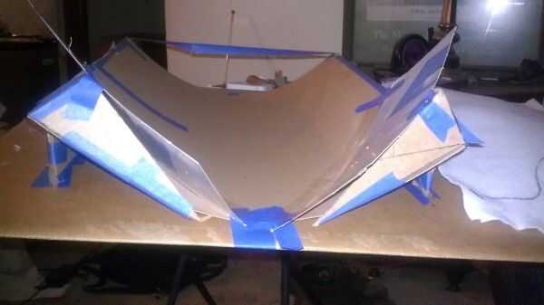 Un pedazo de cartulina fue establecido a través de estos dos puntales y pegado a la Junta en el centro y a las costillas en los bordes. Esto define la curva transversal mayor del parabrisas.
