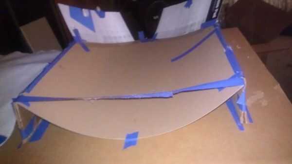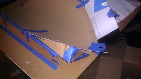 Podría detener en este punto y tienen un molde funcional con una curva simple. Quería que la parte inferior del parabrisas a la curva, así que he añadido dos pedazos de cartón, firmemente a la superficie del molde en un borde y 2" por encima de la superficie en las esquinas. Ver la imagen del vista final.