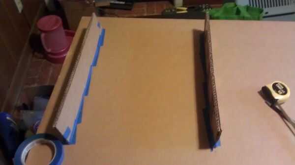 Utilicé un trozo de cartón de corrigated pesado para una base de molde. Una tapa de tabla o madera contrachapada funcionaría así. Mi parabrisas era tener un lugar en los bordes de alrededor de 3", así que empecé haciendo dos puntales de 3" de altura de cartón corrigated, duplicado en resistencia. Estos fueron grabados hasta el fondo, paralelo entre sí, y un par de pulgadas más separados que el ancho del parabrisas. Ver la primera foto.