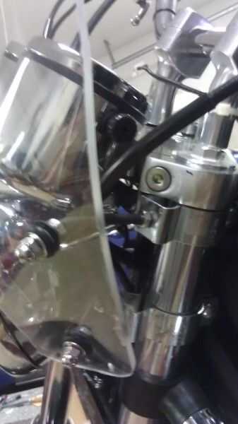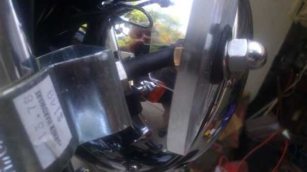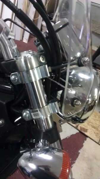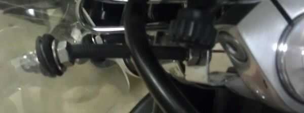 Cuando todo estaba montado correctamente tomé los puntales uno a la vez y se deslizó tubería de encogimiento de calor sobre ellos. Un fósforo encendido tira el plástico apretado y cubre los hilos de rosca. Esto se ve mejor, y mantiene la galjanoplastia de roce. También protege los cables (cables de acelerador, freno, cables y velocímetro) que podrían tocar el puntal.