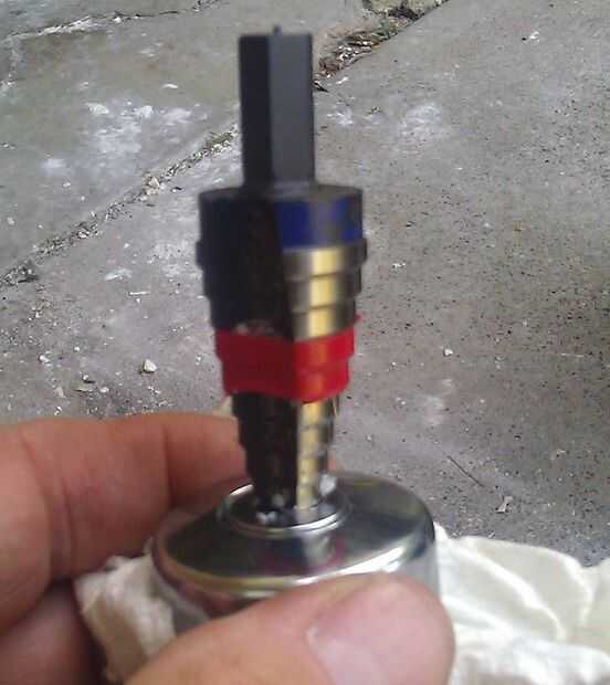 Ubique los orificios para permitir una línea recta de la curva a la abrazadera. Taladro con mucho cuidado. El taladro escalonado mostrado hará un orificio limpio sin riesgo de agrietar el plástico. De lo contrario perforar sucesivamente más grandes para minimizar el astillado.
