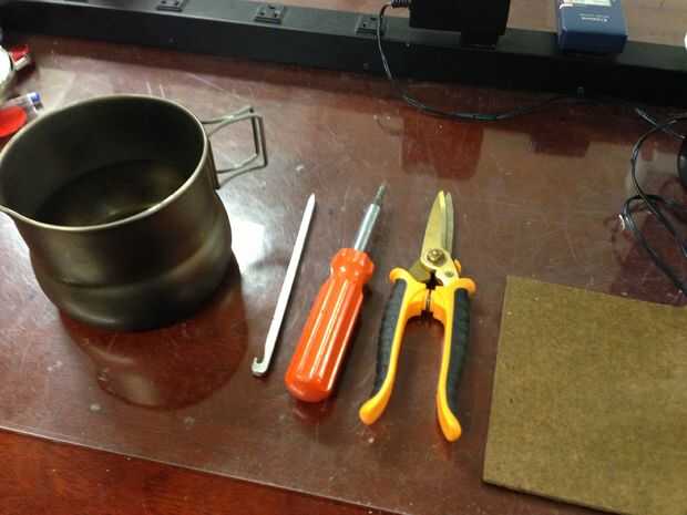 * Pan de Turquía/asar de aluminio * Camping olla de cocinar * juego de tienda metal (1) * destornillador punzón para hacer agujeros * Tienda de tijeras o tijeras de aviación * pedazo de chatarra madera/mdfnot