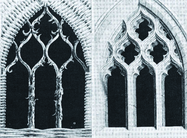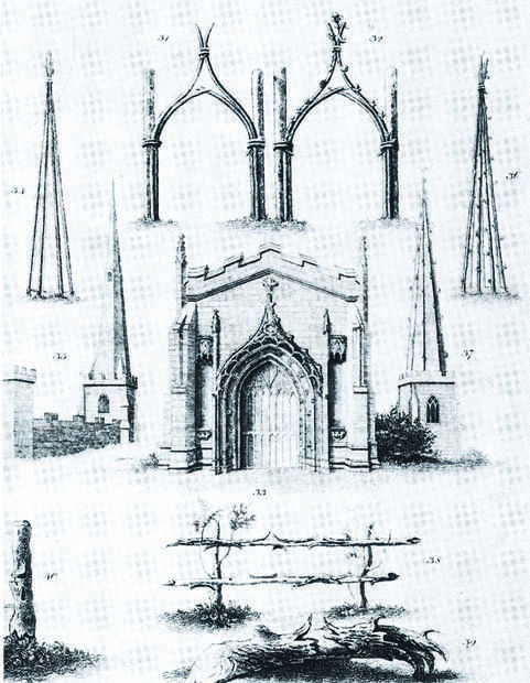Ensayo de Laugier sobre arquitectura de 1753 ofrece una ilustración de los árboles como la arquitectura y la naturaleza al mismo tiempo y que es formalmente y performativamente interesante comparar con la figura de Viollet-le-Duc de 1875, donde la ingeniería es el único auténtica. De nota, interés de le-Duc con arquitectura gótica y su traducción formal para el nuevo material de la época--arrabio--se hace eco de la reflexión del arte textil de las geometrías complejas, basado en la curvatura muchos encontrados dentro de la arquitectura gótica. Ilustraciones de la masonería y, en geometrías particulares, lenticulares, se muestran como se refleja en el árbol de atar, o pleaching, esencialmente, la vinculación de miembros individuales pimpollo para crear nuevas geometrías. Este acto de traslación es de gran interés para mí, así como la espacialidad y complejidad formal que se encuentran dentro de cada ejemplo de arriba, de lanceta a Ogee a tresbolillo.