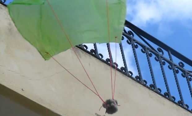deja su peluche con seguridad hacer un salto en paracaídas! Inspirado en la idea fantástica de "parafauna", hicimos un aparato para el transporte de peluches, atados a un paracaídas, a una altitud de unos 7 metros. Una vez arriba, los peluches s