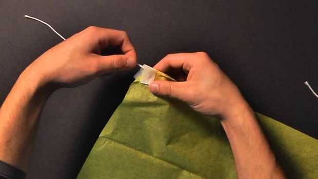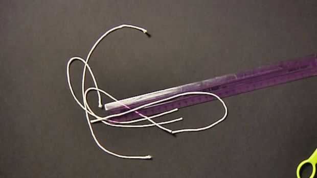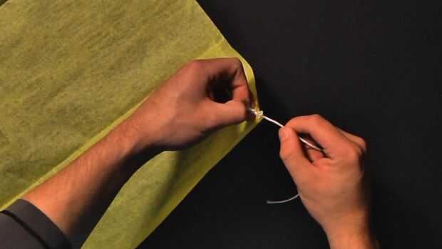 Corte 4 pedazos de cuerda, cada 12 pulgadas de largo. Un trozo de cuerda por cada agujero del hilo de rosca y un nudo. Tenga cuidado de no el rip el tejido. Añadir un trozo de cinta sobre cada nudo para ayudar a reforzar el papel de tejido.