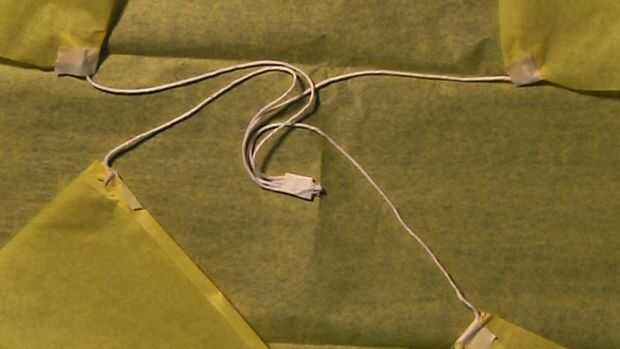 Todas las cuatro piezas de cuerda junto en el centro de la cinta. El paquete de la cadena en el indicador de batería con cinta adhesiva.