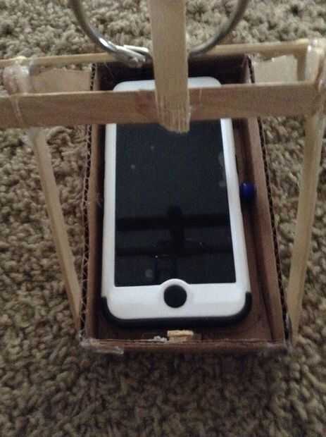El carro de cartón tendrá su teléfono mientras está en el aire. Debe coincidir con el tamaño del teléfono y tiene un orificio en la parte inferior que permite que la cámara vea hacia fuera. Para hacer el carro, cortar el cartón según el diagrama de arriba. Trace el tamaño del teléfono en la cartulina, que provienen de la longitud de cada lado y sobre un centímetro de ancho de cada lado de las aletas. Luego corte un agujero para la cámara sin molestar a las aletas. Luego, doble las aletas hacia arriba y pegamento caliente por lo que permanecen en posición. Finalmente, introduzca su teléfono y añadir perlas y palo la paleta para mantener el teléfono (o un ipod en mi caso) de la mudanza.