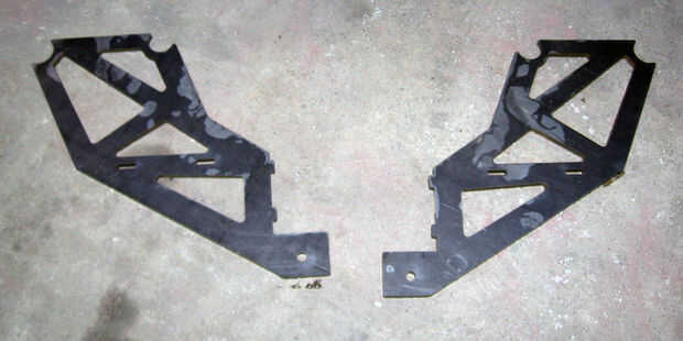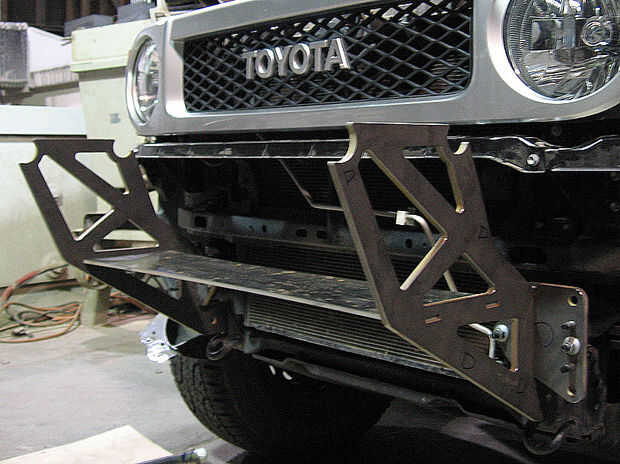 Después de cubrir una vieja manta de lana sobre el capó de la camioneta para proteger la pintura, nos empernó la placa de 3/8" marco de parachoques cuerno Monte las placas (las pequeñas prueba-corte de madera contrachapada) a la existente estructura placas de montaje de cuerno en el camión, añadió el 3/8" placa celosía montantes (vea la primera foto en este paso) y el 1/4" placa de torno , sostenido con una pinza larga muebles, comprobar el ángulo con una escuadra de combinación (y ajustado hasta que la Asamblea fue perfectamente cuadrada) y viro con un soldador MIG.