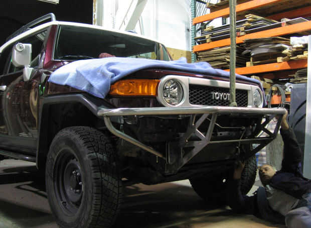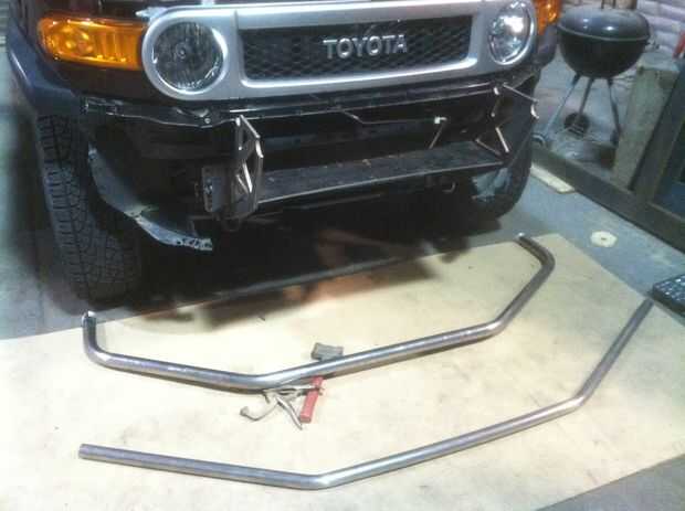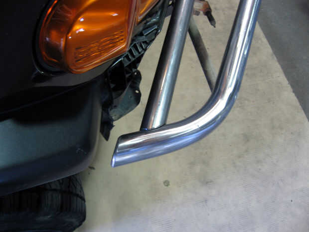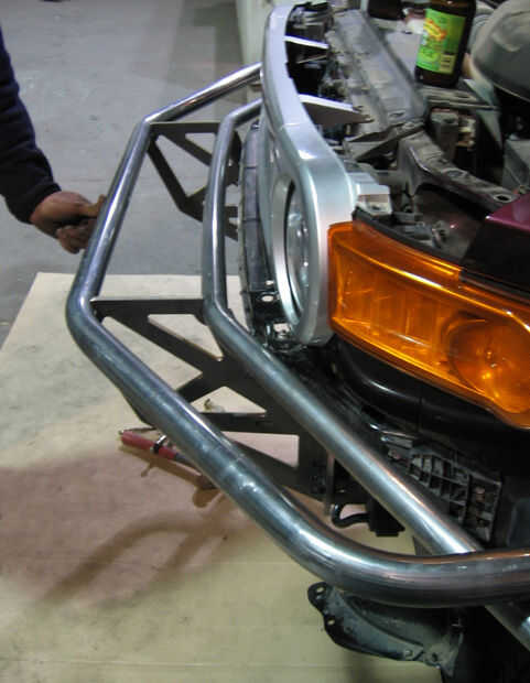 Placas de la mejilla se añadieron a continuación; Perno en previamente agujeros roscados en los lados de los camiones largueros horizontales, que la fijación mecánica de la estructura del parachoques más rígido. Tenga en cuenta que utilizando esta técnica puede, de hecho, reforzar una zona de deformación en el frente del marco, que podría ser un problema de seguridad en caso de colisión frontal. Hay por ahí unos diseños parachoques que ya utilizan esta técnica, y me han dicho muchas personas que esto no dificulta el despliegue de bolsas de aire. Bra es la única empresa que el tope para la FJC ha sido desplome probado para probar esto. Puede reconocer zona deformable de un fabricante señalando pequeños huecos en el tubo del armazón.