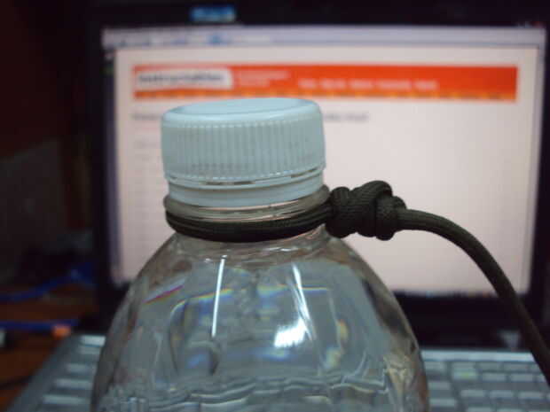 Una vez que el nudo de la forma que gusta, recortar el extremo suelto y quemar con el encendedor. Tenga cuidado, es muy caliente! I mantener un recipiente pequeño de agua al lado de mi trabajo, derretir el cable, moje mi dedo en el agua, entonces calmar y suavizar el cable fundido.Pase el cable por su botella de agua, mantenga el nudo y tire de la línea principal, no demasiado apretada o es difícil de bajar. Se ajuste fácilmente.  Cuando quiere él apagado, sujete el nudo y tirar contra la línea de juego de niños.