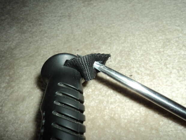 Quirúrgicamente quitar todos menos 2 pulgadas de la correa de muñeca stock en su poste de trekking y derretir el borde para evitar la confusión y batalla.