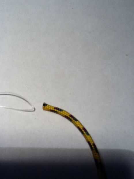 Tome una longitud de línea de pesca de más de dos veces la longitud de la longitud más larga de paracord y doblar por la mitad, poner un pliegue agudo en él. A partir de la longitud más corta de paracord, empuje el sedal doblado por el paracord, pliegue en primer lugar, hasta que sale el otro extremo. Un par de pulgadas de jack-final de los cables de alimentación de un orador a través del lazo y tire el sedal por el paracord así que los cables son a través de todo el camino. Apriete el paracord hasta el altavoz y si quieres, poner alguna tubería del encogimiento del través de la conexión para mantener juntos (Me salté que).
