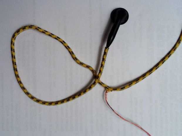 Para la parte inferior de los auriculares, cadena el sedal para arriba desde la parte inferior a través de la ranura en el centro de la parte más larga del cable. Todos los cables de altavoz de cuatro hasta el final de la línea de pesca del lazo y tire de ellas a través de. Pruébelos para asegurarse de que todavía trabajan.