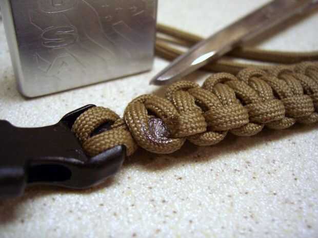 Ahora puede utilizar la tijera para recortar el cable adicional cerca el último nudo que ata. Uno a la vez recortar y utilizar mi encendedor para derretir rápidamente el extremo corto. Espere a un segundo para que el cable fundido a enfriar un poco y luego usar mi pulgar para presionar el extremo fundido en el cordón circundante así que endurece como une. Se debe tener cuidado con este paso. El cable fundido es extremadamente caliente, y es posible quemarse, así que también podría probar usando un soldador o herramienta para el paso de la fusión de Lena si lo desea. O incluso utilizar algo como un cuchillo de mantequilla, al lado de su encendedor o la sección estriada de una herramienta para aplanar el extremo fundido del cordón para terminarlo.