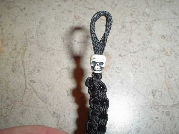Los granos de cráneo utilizo eran demasiado pequeños como para caber sobre el cierre del lazo de mi pulseras; por lo tanto, he utilizado un punzón de una navaja suiza y aburren con cuidado el orificio existente, hasta que, con mucho esfuerzo, conseguí que el grano. Otros granos pueden caber mejor. Una perla realmente ayuda a apretar el lazo, de modo que no es demasiado descuidado y realmente mejora el aspecto general de la pulsera.