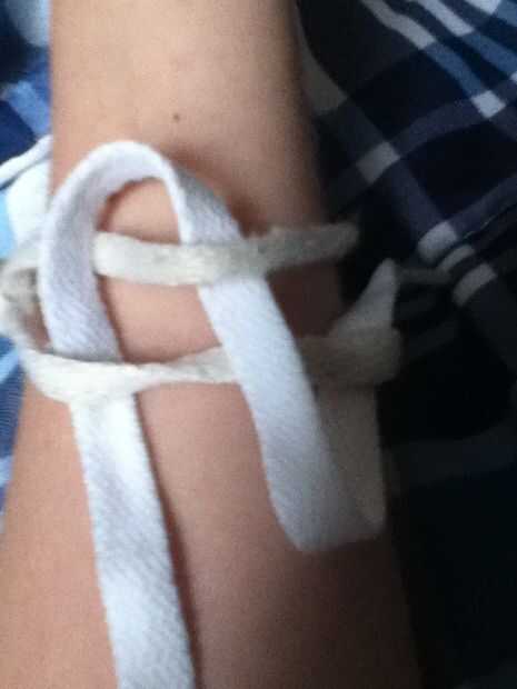 Debe haber dos trozos de cordón alrededor de su mano atada en un nudo. Comienzan en un lado del nudo y trabajar su camino a la otra (imagen). Así como el tejido normal.