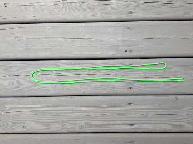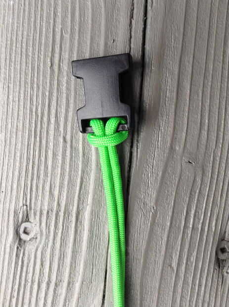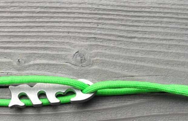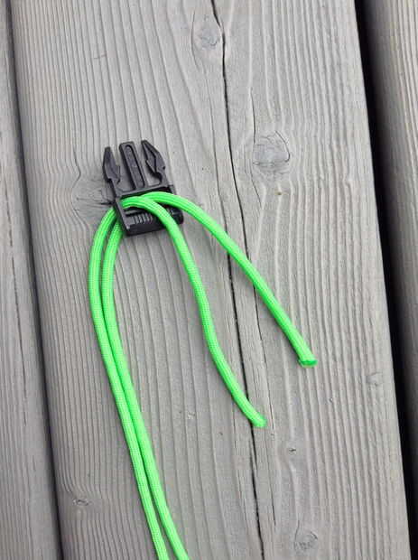 -Hilo de abajo una cuerda de paracord a través del "ojo" de la espina de pescado. Luego pase el cable a través de arriba. (Imágenes 4 y 5)