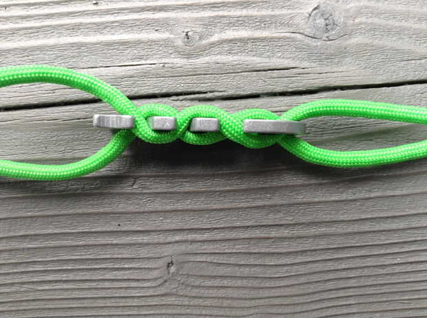 -Enrosque el centro de la médula a través de la ranura en una de las mitades de la hebilla, luego enrosque los extremos a través de él y les Tire firmemente.