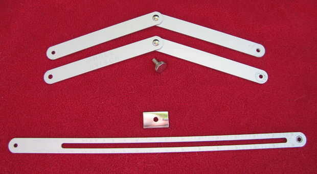 Retire el tornillo de mariposa ajustable y mantener la barra ranurada y brillante guía rectangular pieza (parte inferior de la segunda foto), desechar el resto del divisor de ángulo. Use una ¼" broca para agrandar el agujero en la pieza de guía rectangular brillante. El agujero está muy cerca de ¼" ya, pero todavía necesita ser ampliado.