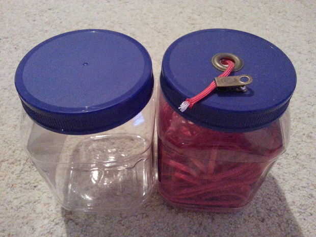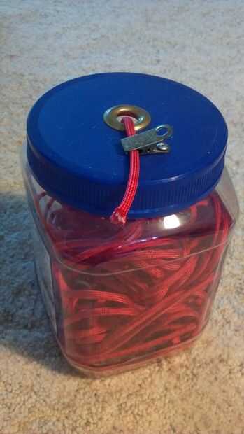 Utilizar envases vacíos de "Mixed Nuts" para sostener mi 550 paracord en. Cuando llego una nueva madeja de paracord, me lo saque y colóquela en el piso, de un extremo de mi casa a la otra en varios bucles largos. Me comenzar tirando de un extremo en el envase de plástico luego seguir alimentándolo hasta que hay no más para alimentar. Me tome el extremo del paracord y empuje aunque el gromment agujero en la tapa del contenedor y fíjelo con el clip de latón. Ahora cada vez que tenga una longitud de paracord, yo puedo tire de ella hacia arriba y fuera del contenedor sin ningún temor de nudos o enredos.