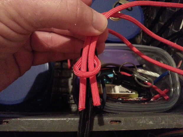 Trabajo final de paracord a través del "ojo" de la bahía en el cierre más bajo del hilo de rosca.  Tire con fuerza este nudo.