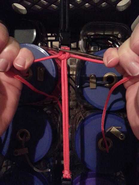 Tire del extremo hacia la hebilla Fastex de fondo y medir la longitud de la pulsera tamaño final.  Solía tener un tiempo duro ATA el primer nudo y cierre en mi longitud final, usé un par de pinzas para sujetar juntos los cuatro paracords. Esto hizo mucho más fácil iniciar mi primer nudo. Una vez tengas, puede quitar las pinzas.