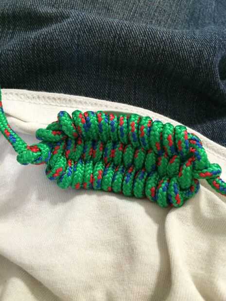 esta es una manera útil para hacer un cabestrillo.  ¿Qué hace bien?  No necesita utilizar dos trozos de cable, y si usted necesita la cuerda por otra razón rápidamente, apenas se desate el lazo del dedo y el nudo de tope, tirar de la cadena a través