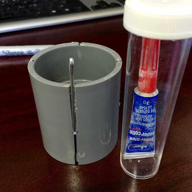 Líneas de marcador 4 a lo largo del acoplamiento de PVC (que donde los pasadores sentar en). Con una herramienta Dremel, han tallado hacia fuera las líneas que se ajustan los 4 pernos (Asegúrese de que no cortar a través del tubo) y asegúrese de que los pasadores se sientan en estrecha y plana en la superficie.
