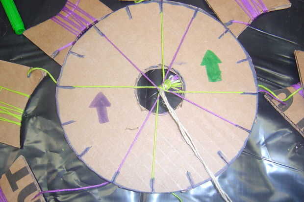Paso 1. todos los hilos verdes saltan por encima de los hilos púrpura móvil reloj contrario sabio.