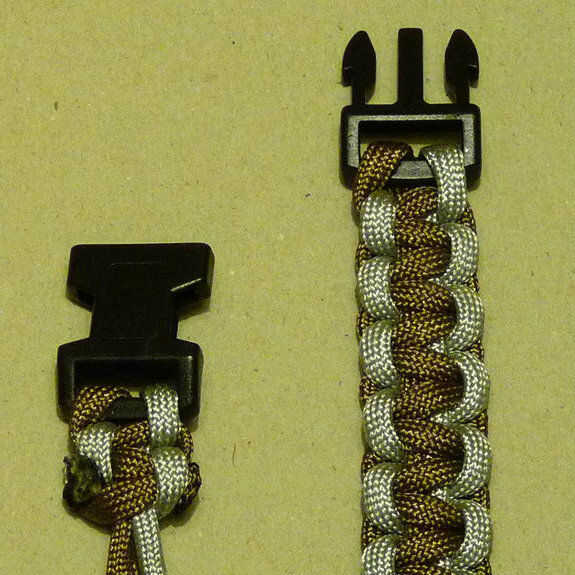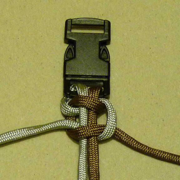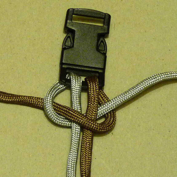 Para el basic uno comience con tirar el paracord a través del clip y muévase a la longitud que desea para ser. Luego paso un extremo delante de las cuerdas y el otro en la parte trasera y por los lazos que creó. Es simplemente un nudo repetido en direcciones opuestas como en un nudo cuadrado (usted podría repetir en la misma dirección, acabará como un espiral). En mi caso en la parte delantera elegir 6 cm (2.5 en) desde el último nudo, en la parte trasera 18 cm (7 pulgadas) desde el último nudo.