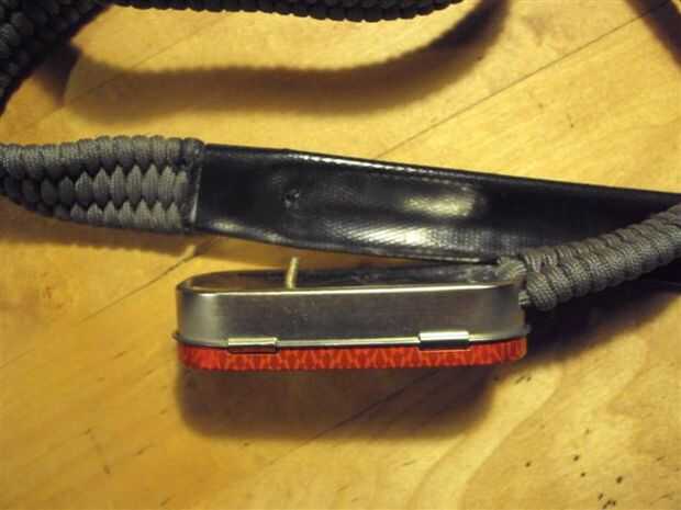 Decidí que iría con la típica hebilla de diseño (Foto 3) con un gancho y los agujeros para sujetar. Pero necesitaba el extremo de la correa al ser un material diferente que yo podría hacer agujeros en. Cinta adhesiva para conductos. Esto funcionó bien porque quería incluir por lo menos unos pocos pies de cinta adhesiva en el kit pero la lata es demasiado pequeña como para caber cualquier cantidad de cinta adhesiva.