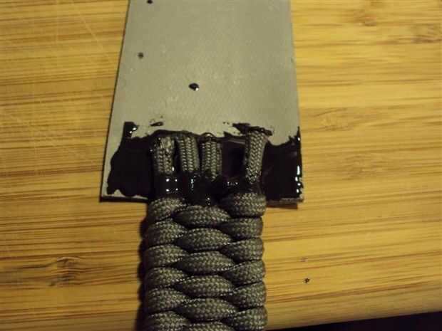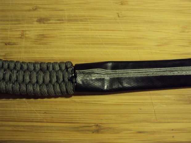 Actualización importante!!!!!! Pegar el lado pegajoso de la cinta del conducto es una idea desafortunada. No funciona demasiado bien... Luego utilizar una grapadora normal y poner varias grapas directamente a través de la cinta y el paracord. Presionado muy fuerte que no debe fallar