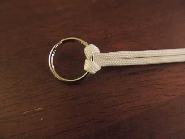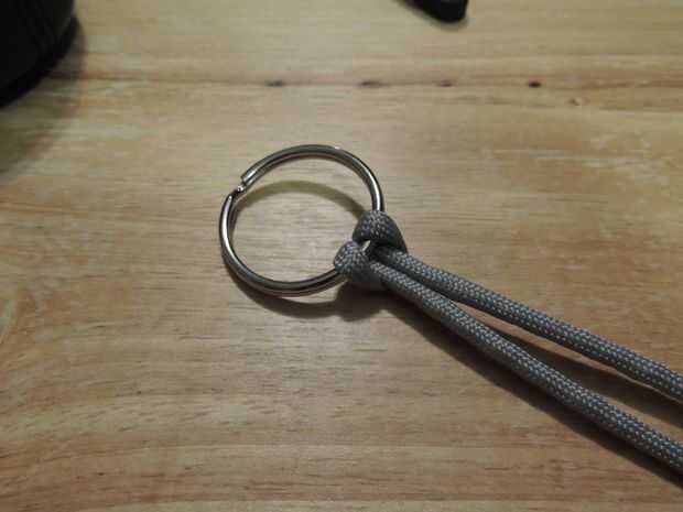 Conecte el paracord al aro plegable el paracord en mitad, empujando el extremo doblado a través del anillo y empujando los extremos de la cuerda a través del lazo del doblez. Tire con fuerza.