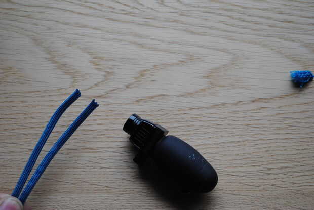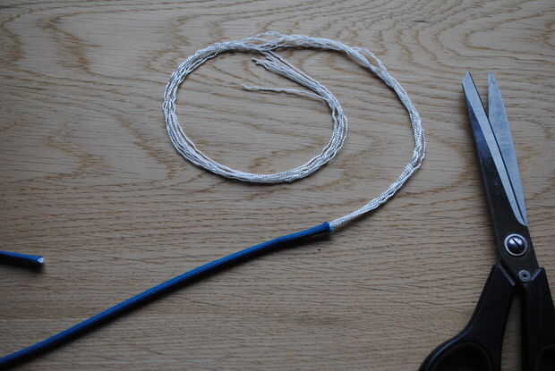 En primer lugar tenemos que quitar los filamentos blancos internos del cordón. Esto hace que el cable mucho más fino y más conveniente para un collar para un perro pequeño. Si tienes un perro grande puede siempre dejar los filamentos intactos si lo desea, pero puede ser difícil para la sección de bozal atravesar el anillo de acero por lo que sin duda lo recomiendo para por lo menos la sección de la boca.