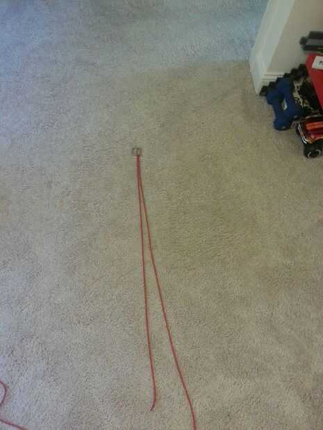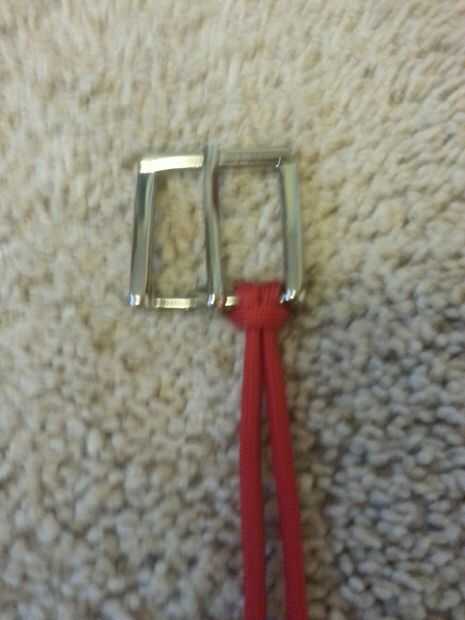 crear un enganche de vacas en el cinturón de hebilla (el lado con la punta de metal Unido) crear el enganche de las vacas en rhe extremo de la cuerda. el cable más corto los hilos de núcleo y esto cuánto será la correa, no se preocupe por quedarse sin cable porque 100 pies de cable de trabajo tiene un montón de espacio para trabajar con.