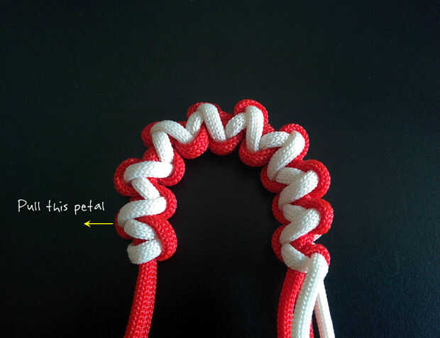 me inspiré para hacer esto de la 'flor del desierto de Paracord'. Lo que hizo wcstart con la cobra de la armadura, pero deja a un lado como un bucle vs tirando firmemente - esto forma 'Pétalos'. Cuando suficientemente largo doblado alrededor y sutura