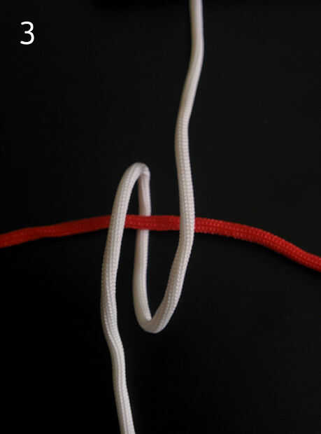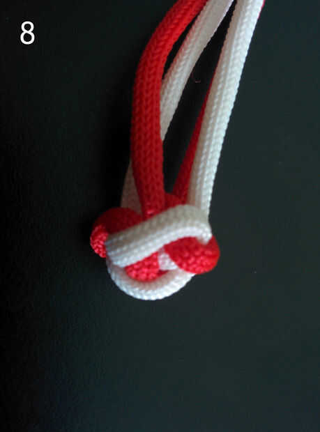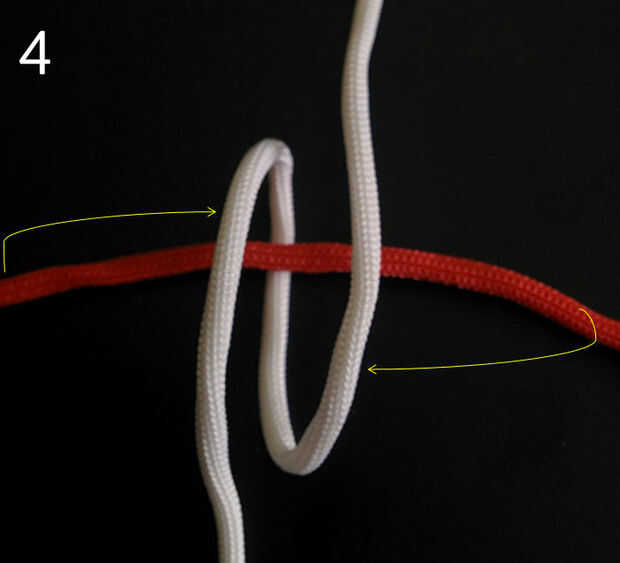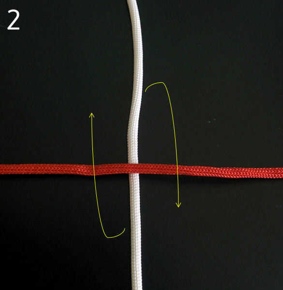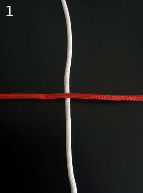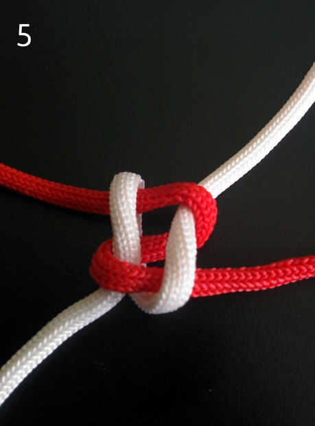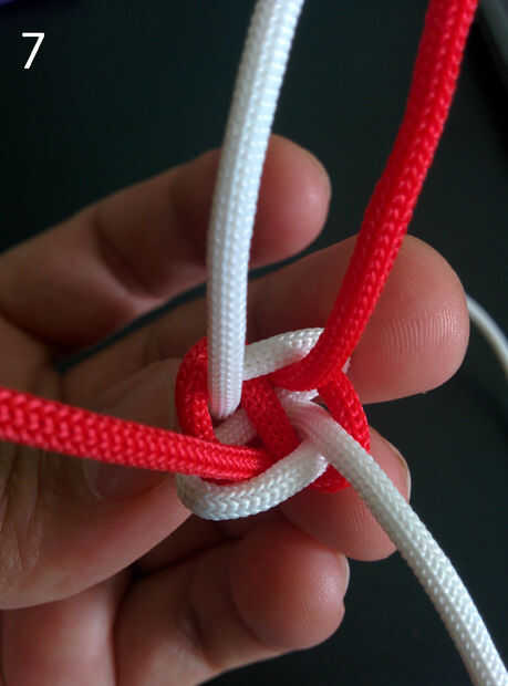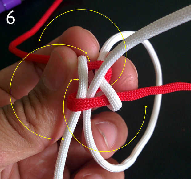 4. Inserte el cable blanco izquierdo superior debajo de la cuerda roja izquierda inferior en el centro del nudo cruzado (que sí el anterior arreglo de cuerdas se llama nudo cruzada). Ver imagen 6.