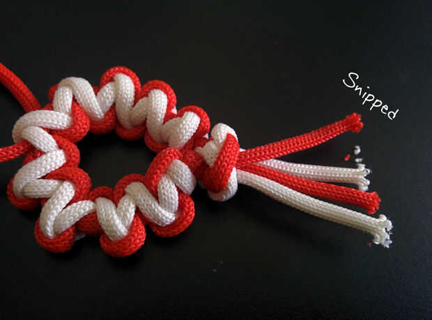 me inspiré para hacer esto de la 'flor del desierto de Paracord'. Lo que hizo wcstart con la cobra de la armadura, pero deja a un lado como un bucle vs tirando firmemente - esto forma 'Pétalos'. Cuando suficientemente largo doblado alrededor y sutura