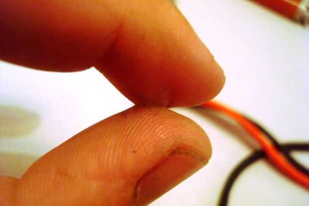 Bueno, después de empujar el extremo de los cables por el orificio de salida, tomar una gota de pegamento y pegar los extremos de las cuerdas hacia abajo, esto solo ayuda a mantenerlos ordenados y fuera del camino. Sólo no superglue los dedos juntos.
