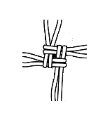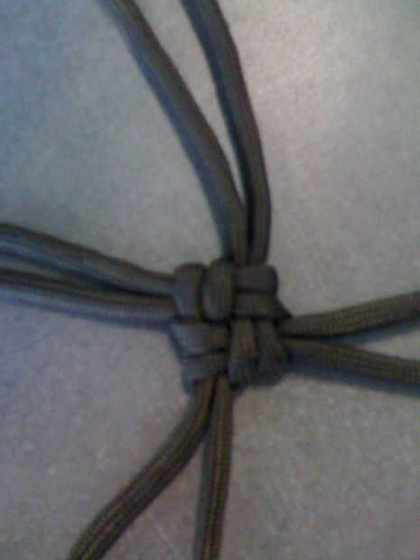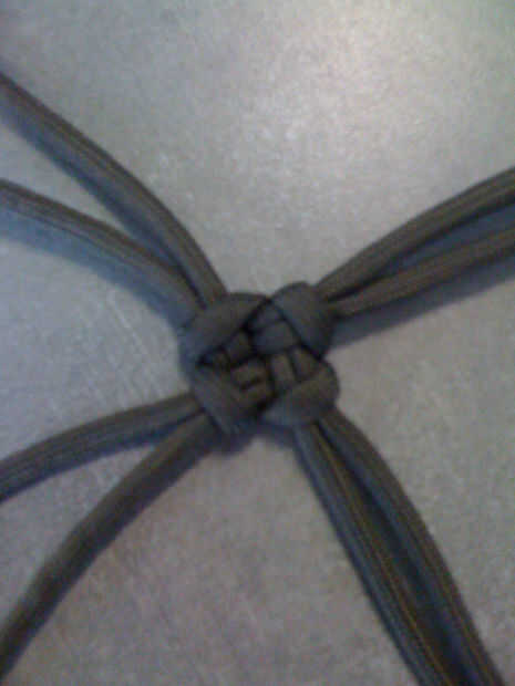 En primer lugar vamos a empezar el nudo chino buena suerte para el nudo base.  Tomar las cuatro hebras de paracord y doblar por la mitad.  Poner una curva de 90 grados en el centro y enrollar los extremos para hacer más corto si quieres.  Luego sólo tienes que seguir los siguientes pasos.  Hacer seguro cinch lo para arriba apretados antes de continuar con los próximos pasos.