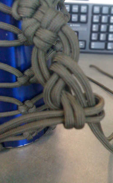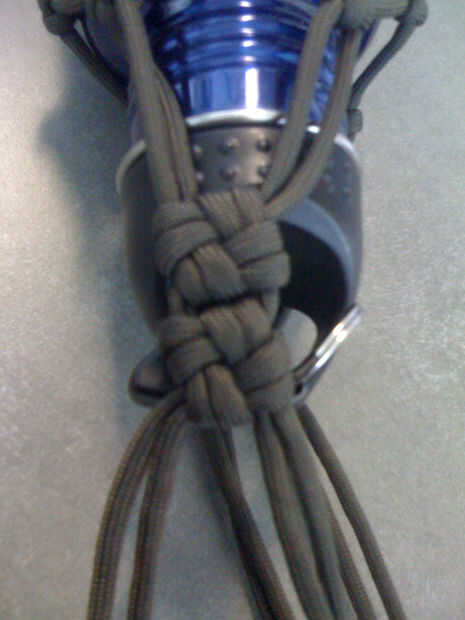 Sólo vamos a reducir el tejido hasta 2 grupos de 4 hilos para las asas. Para hacer este solo tome dos de las mechas y ahora tratarlos como una sola hebra y hacer otra Cruz nudo más arriba. Tengo 2" del cable de la pequeña Cruz nudo a nudo grande para comenzar el mango.