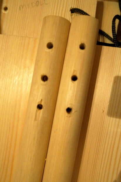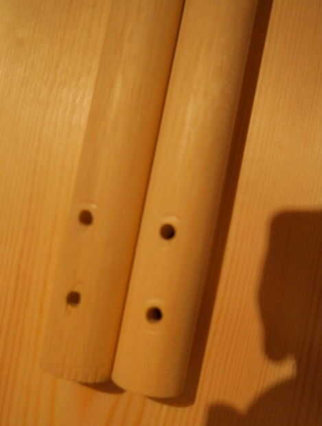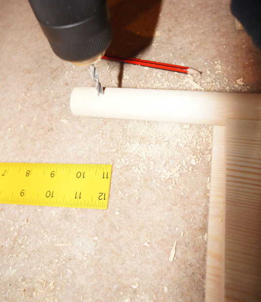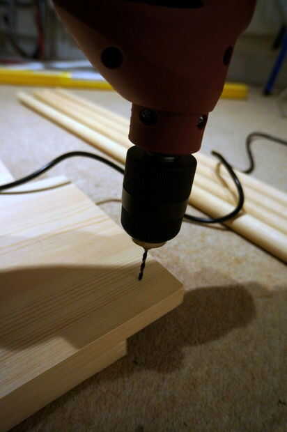 Los agujeros superiores a partir de unos 3cm de la parte superior del dowl cada taladro a través del centro de la el dowl con una separación de 3cm entre cada uno.