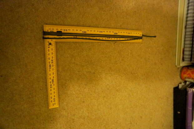 Consejo: tendían a usar múltiplos de pies para medir la paracord. Puede utilizar una envoltura de regla el cable longitudinalmente alrededor de él. Cada lazo es doble de la longitud de la regla tan fácil calcular cuánto cable necesita. (ver foto)