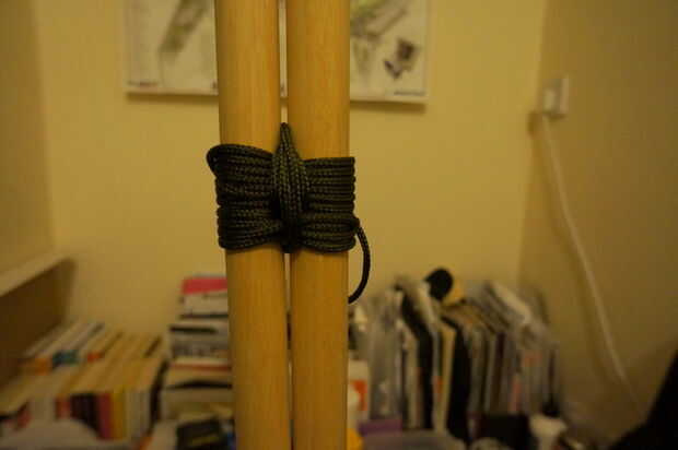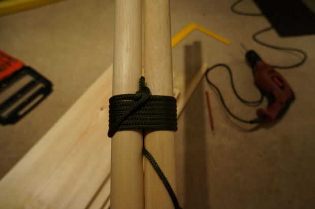 Primer paso es unir las varillas dowl. Para este primer paso te necesita cortar una longitud de paracord alrededor 3.5m (12 pies) de largo.