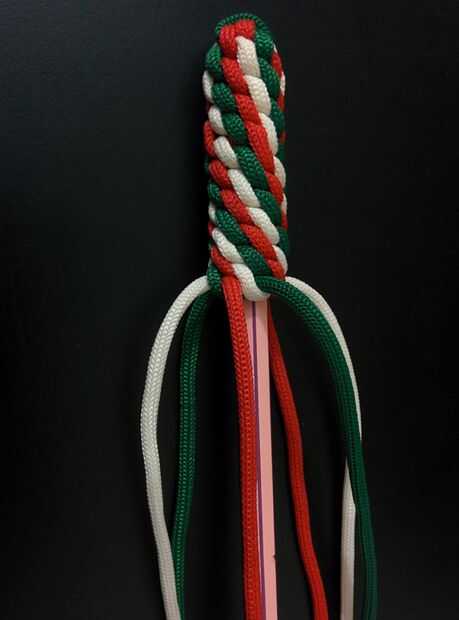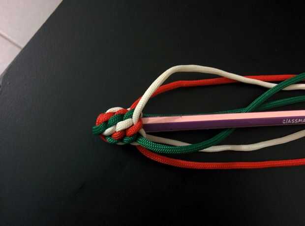 Nota: me tomó un tiempo para entender este paso muy útil. Sin lápiz, cuando se intenta estirar las cuerdas para hacer un nudo firme, usted puede terminar con desigual sinnet, algunos nudos pueden estar sueltas, mientras que otros pueden ser ajustados. Mantener un lápiz en el centro mientras se trabaja hacia arriba se asegurará de que fob todo tiene el mismo espesor. Puede estirar las cuerdas sin tener que preocuparse demasiado flojo o demasiado apretado. Esto también asegurará que el compartimiento secreto dentro está intacto.
