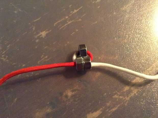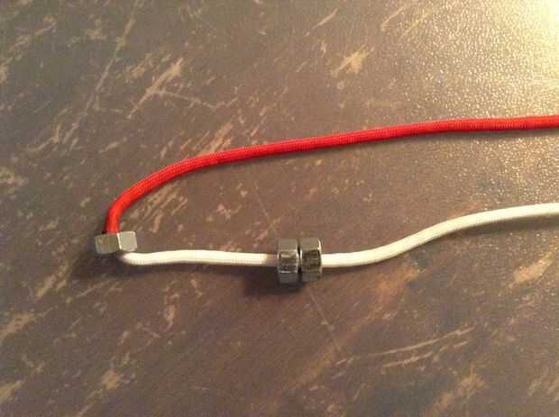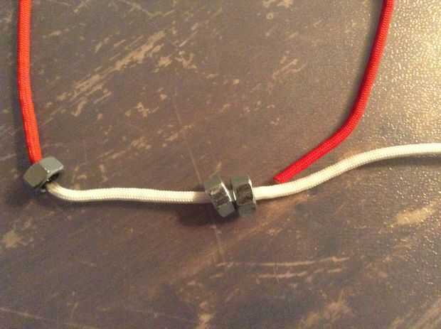 Ok ahora dos tuercas y los pone en la cuerda blanca. Obtener su cadena rojo y coser aunque sus tuercas. Después de que pase la cuerda roja en apretar las cuerdas y asegúrese de que la primera tuerca está en el centro. Ahora sigue añadiendo en