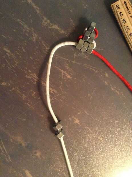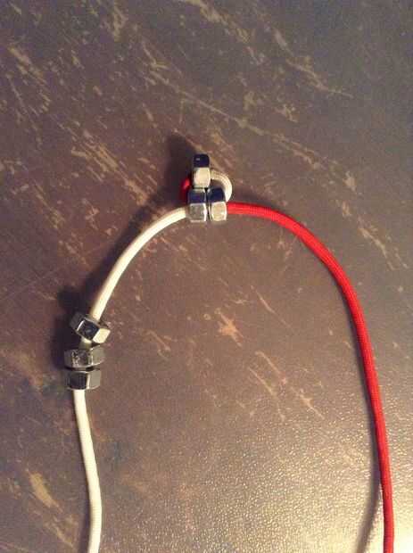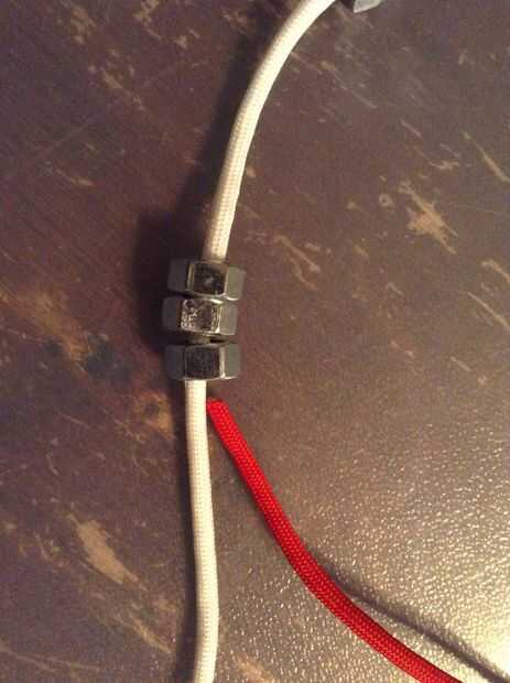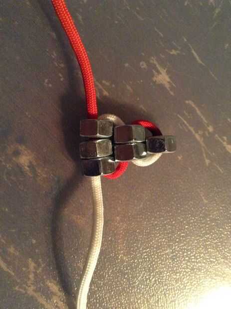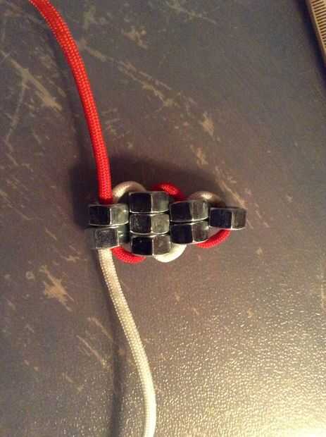 Ok ahora añadir tres más tuercas en la cadena de blanco y el hilo rojo a través de las tuercas del hilo de rosca. Luego apriétela. Añadir dos tuercas más. Luego vuelva a apretar.